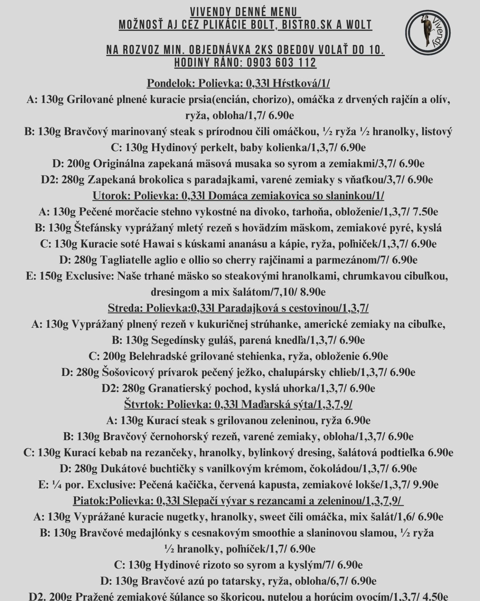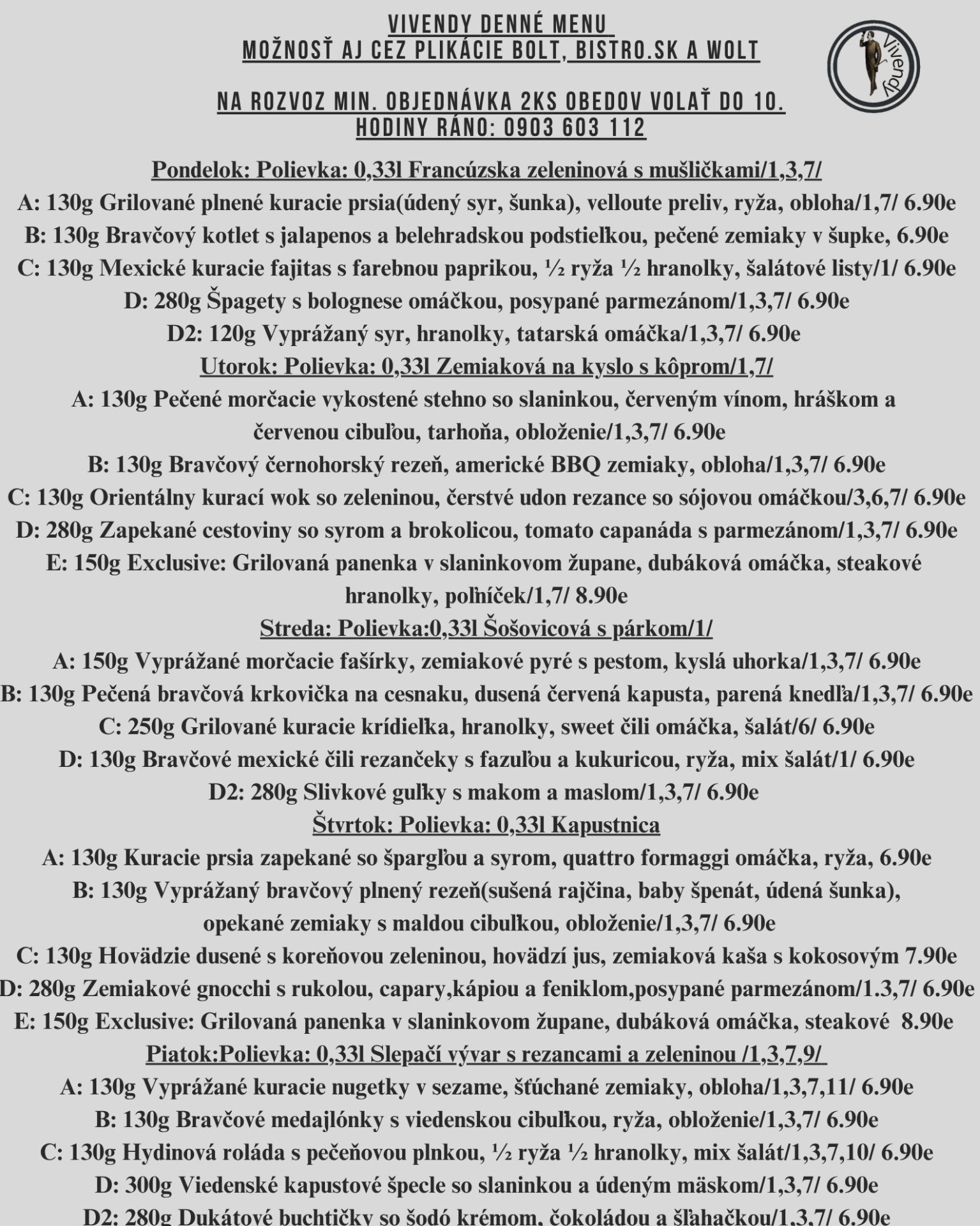 Objednávky denného menu príjmame telefonicky každý pracovný deň do 10:00h ráno